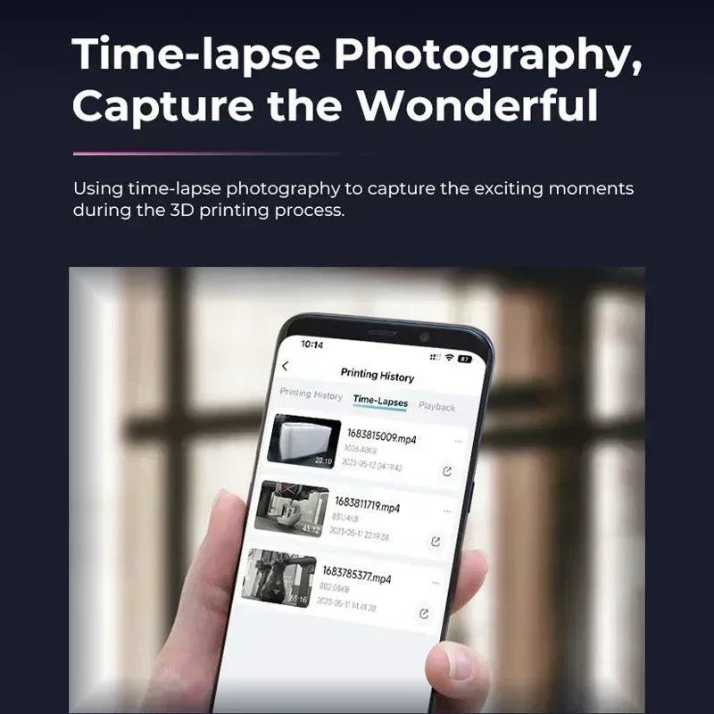 Timelapse-filmopname: Biedt een geavanceerde functie om automatisch timelapse-video's op te nemen van het printproces. De software bewerkt de beelden, zodat het lijkt alsof het object magisch uit de bouwplaat groeit.