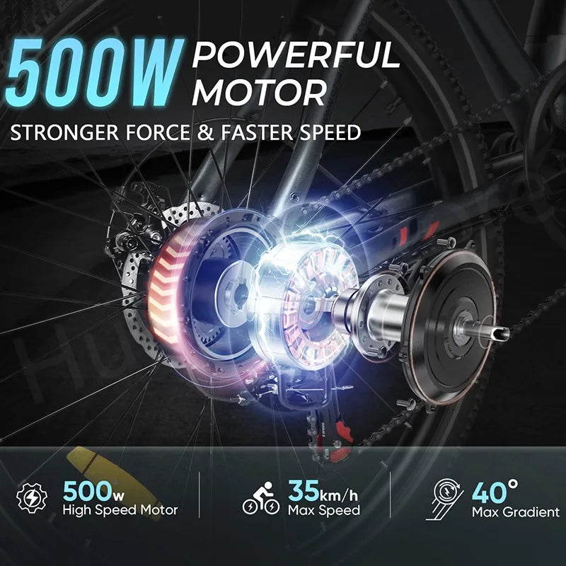 | Motor | 500W | Een krachtige motor (meestal in de achternaaf) die zorgt voor snelle acceleratie en hulp bij het klimmen. Let op: Deze kracht overschrijdt de $250 \text{ W}$-limiet voor standaard e-bikes in de EU. |