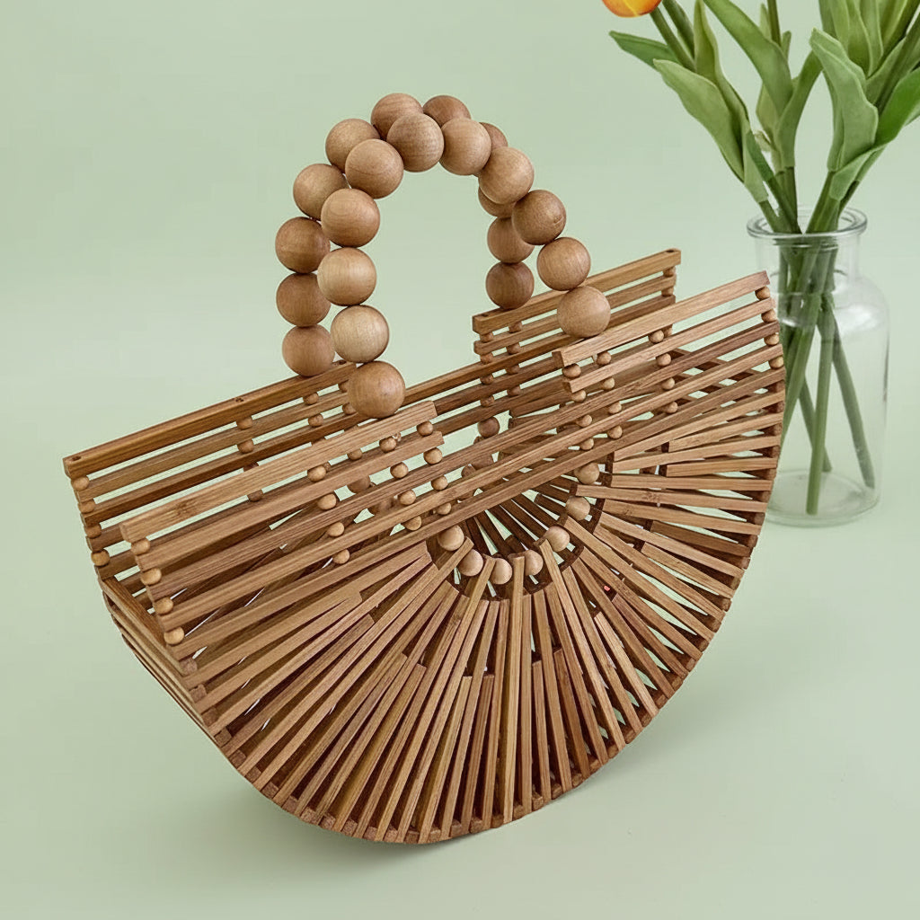 Deze elegante, handgemaakte damestas combineert natuurlijke materialen met een luxe design. De unieke uitgeholde constructie van bamboe en geweven stro wordt geaccentueerd door het prachtige parel handvat. Deze modieuze tas is het perfecte accessoire voor stranddagen, vakanties en alle elegante zomerse gelegenheden.