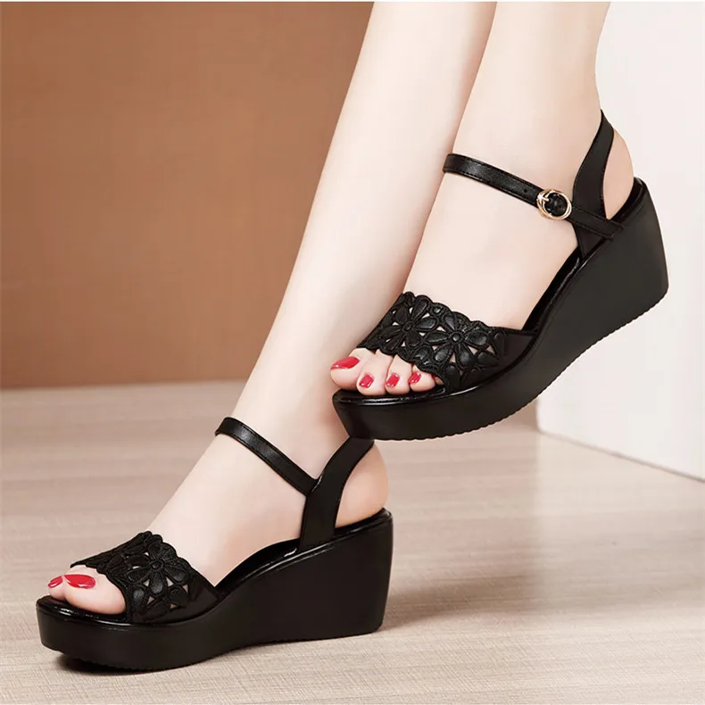 Deze modieuze zomersandalen uit de nieuwe 2024-collectie combineren comfort en stijl. Ze zijn voorzien van een dikke platform sleehak met een comfortabele middelhoge hak, ideaal voor dagelijks gebruik. Gemaakt van zacht leer en verfraaid met een delicate bloemenuitsparing. Deze zwarte strandsandalen zijn ontworpen voor dames, en worden door hun comfort vaak gekozen door moeders.