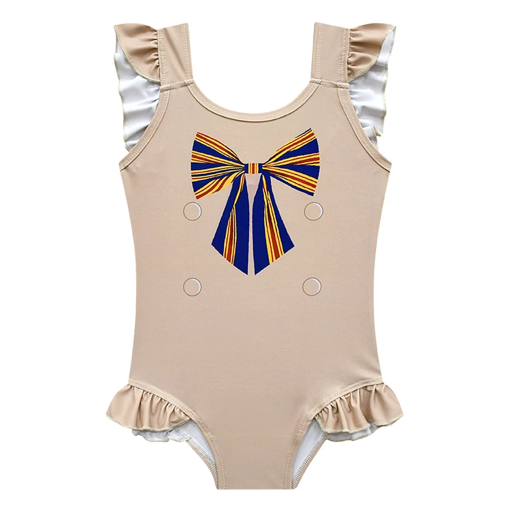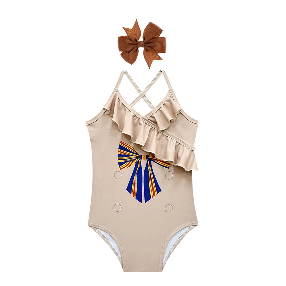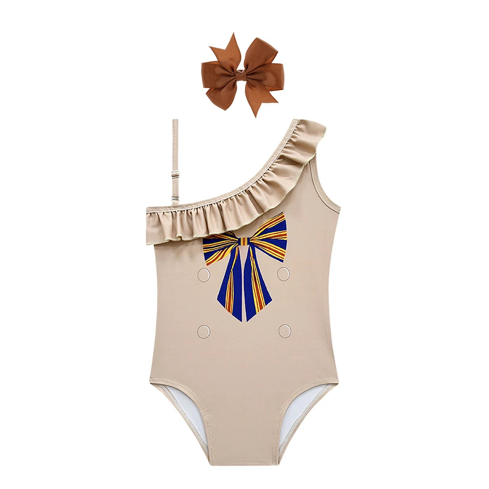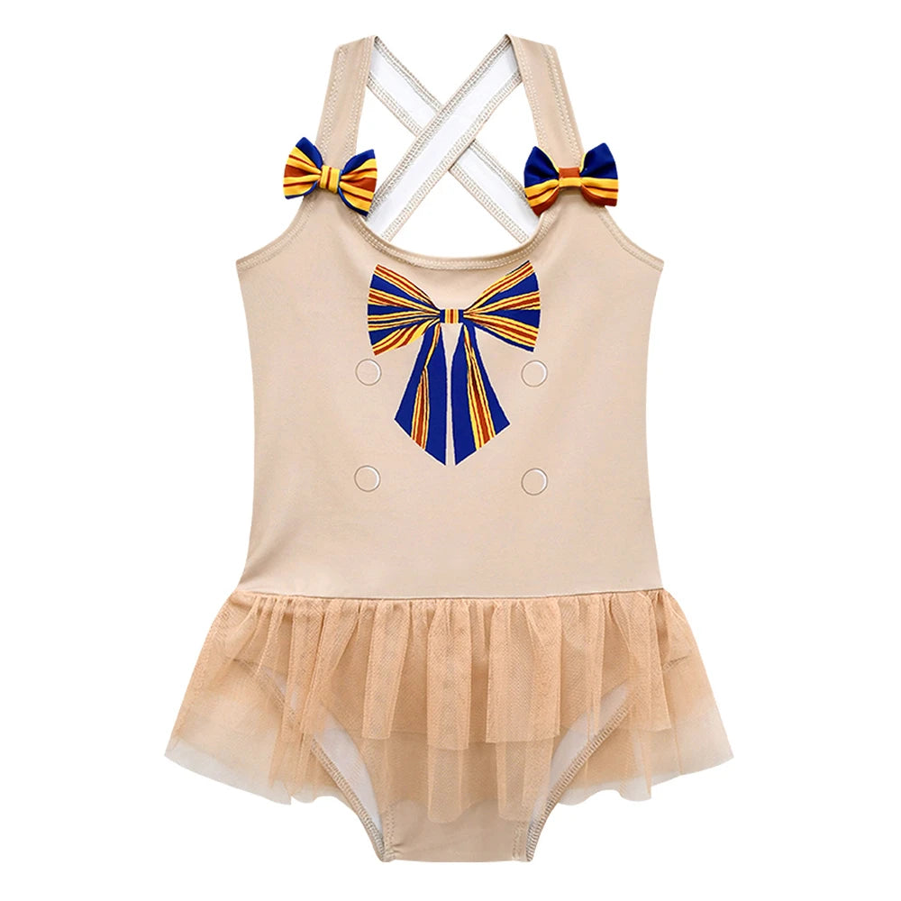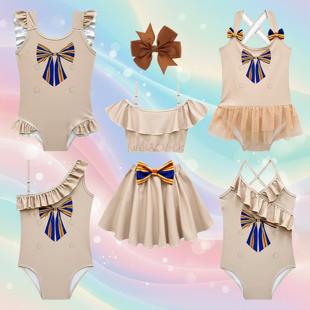 Dit is een eendelige badkleding voor meisjes, geïnspireerd op het populaire personage M3GAN uit de recente films. De stijl bootst een schooluniform na, compleet met een grote khaki strik en een vest-look (het 't' in de originele naam verwijst waarschijnlijk naar het vest-gedeelte). Het is ideaal als cosplay kostuum of als opvallend badpak.