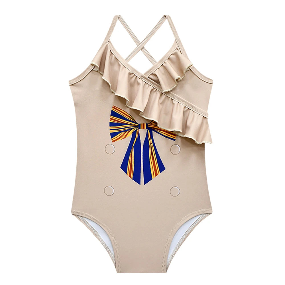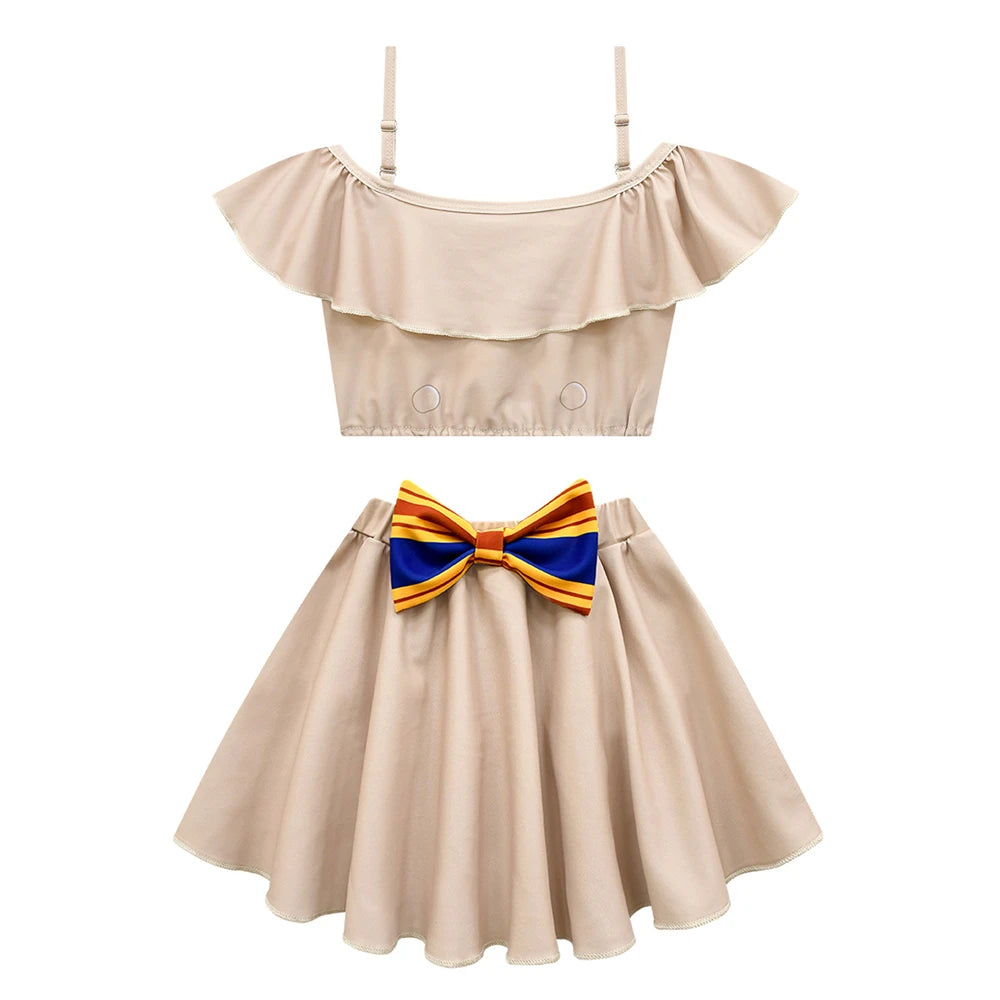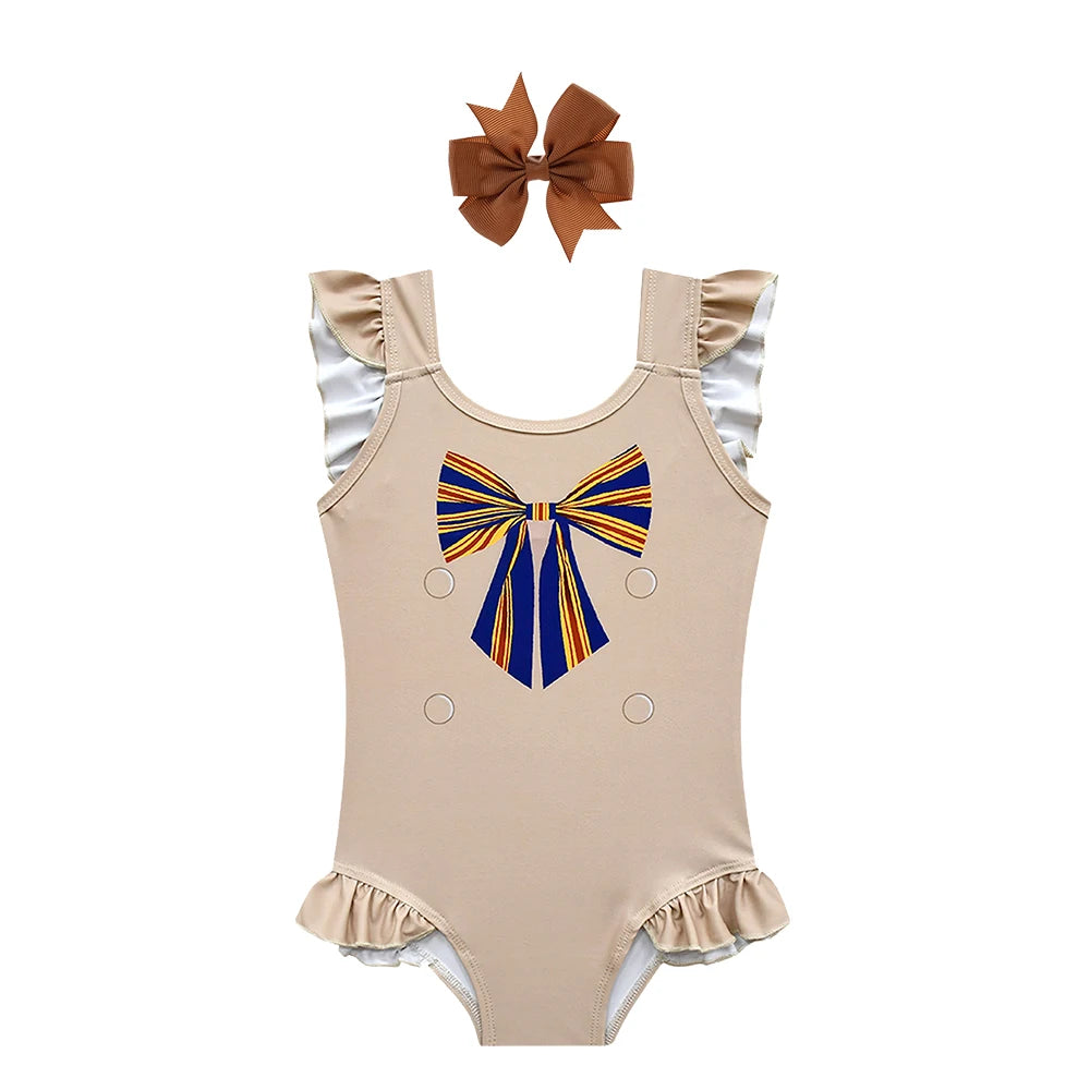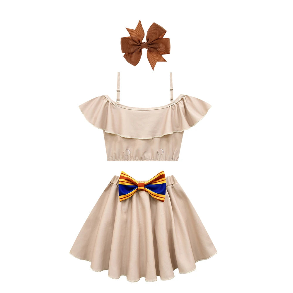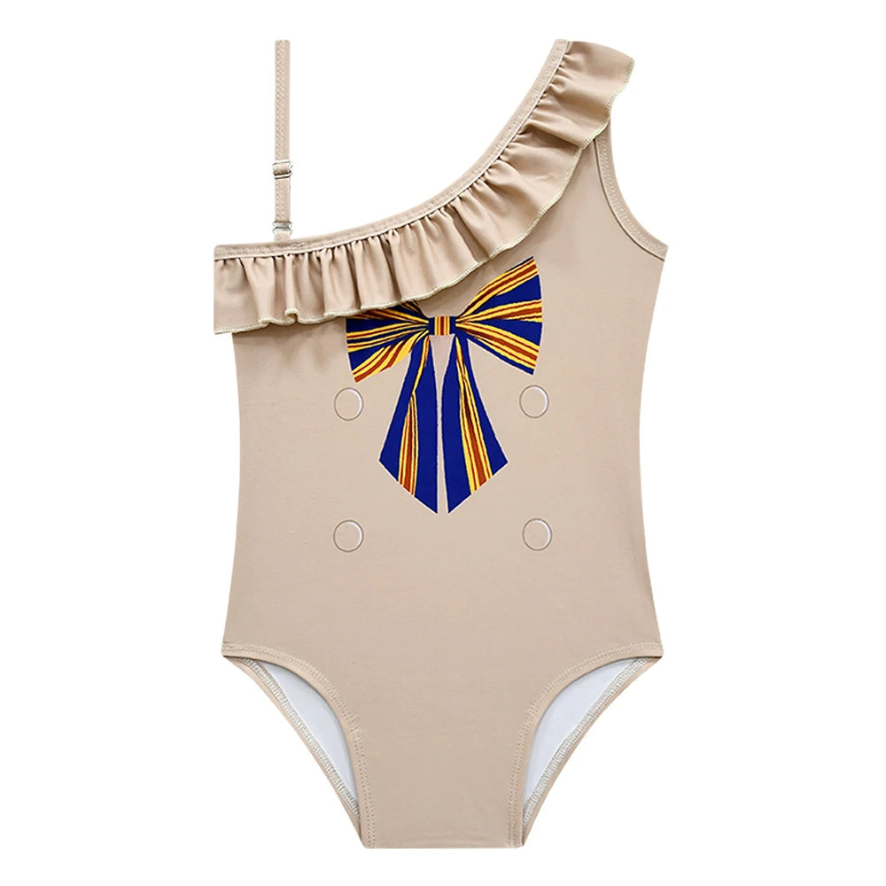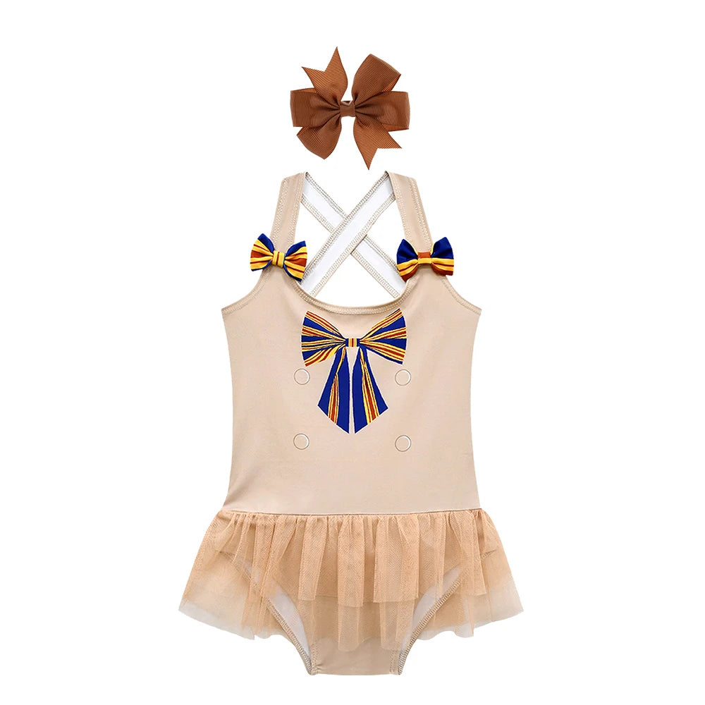 Dit is een eendelige badkleding voor meisjes, geïnspireerd op het populaire personage M3GAN uit de recente films. De stijl bootst een schooluniform na, compleet met een grote khaki strik en een vest-look (het 't' in de originele naam verwijst waarschijnlijk naar het vest-gedeelte). Het is ideaal als cosplay kostuum of als opvallend badpak.