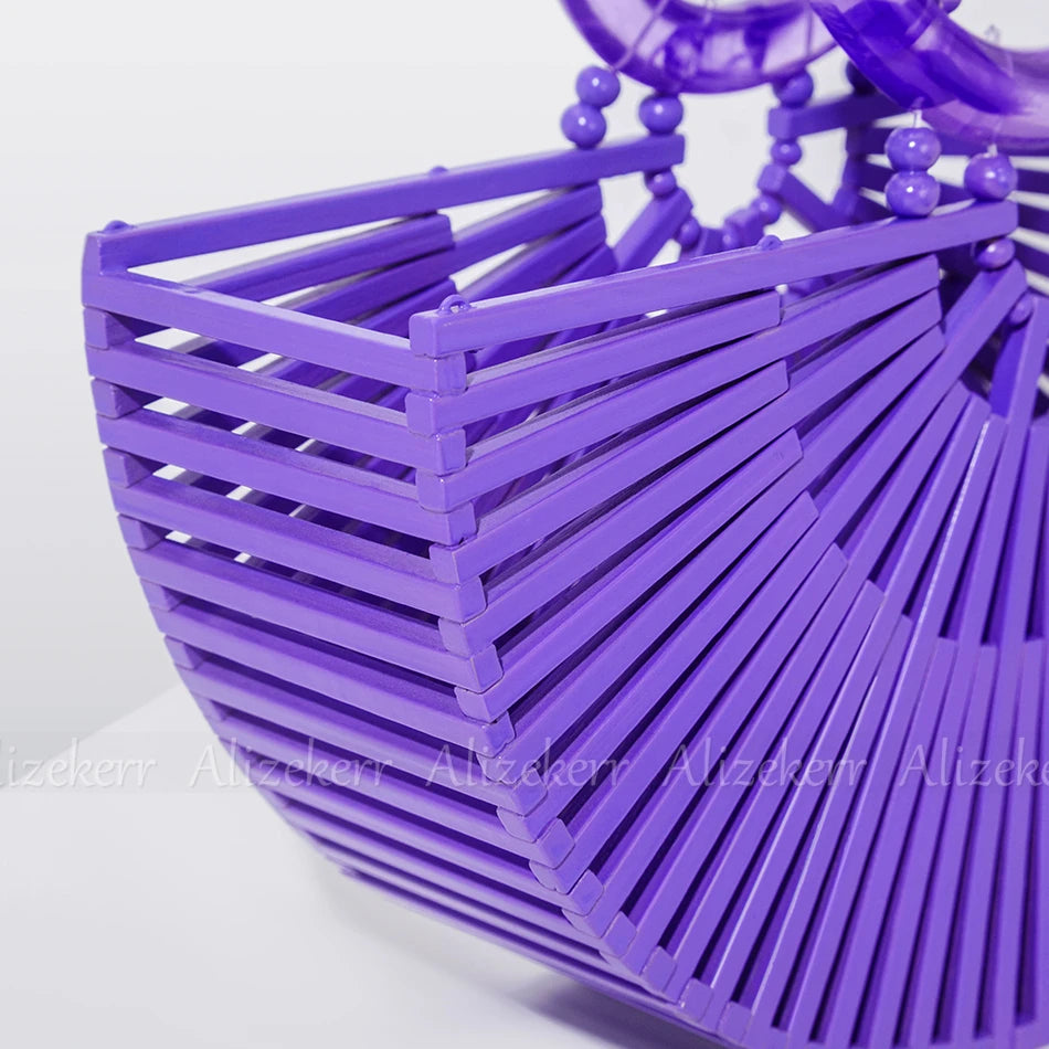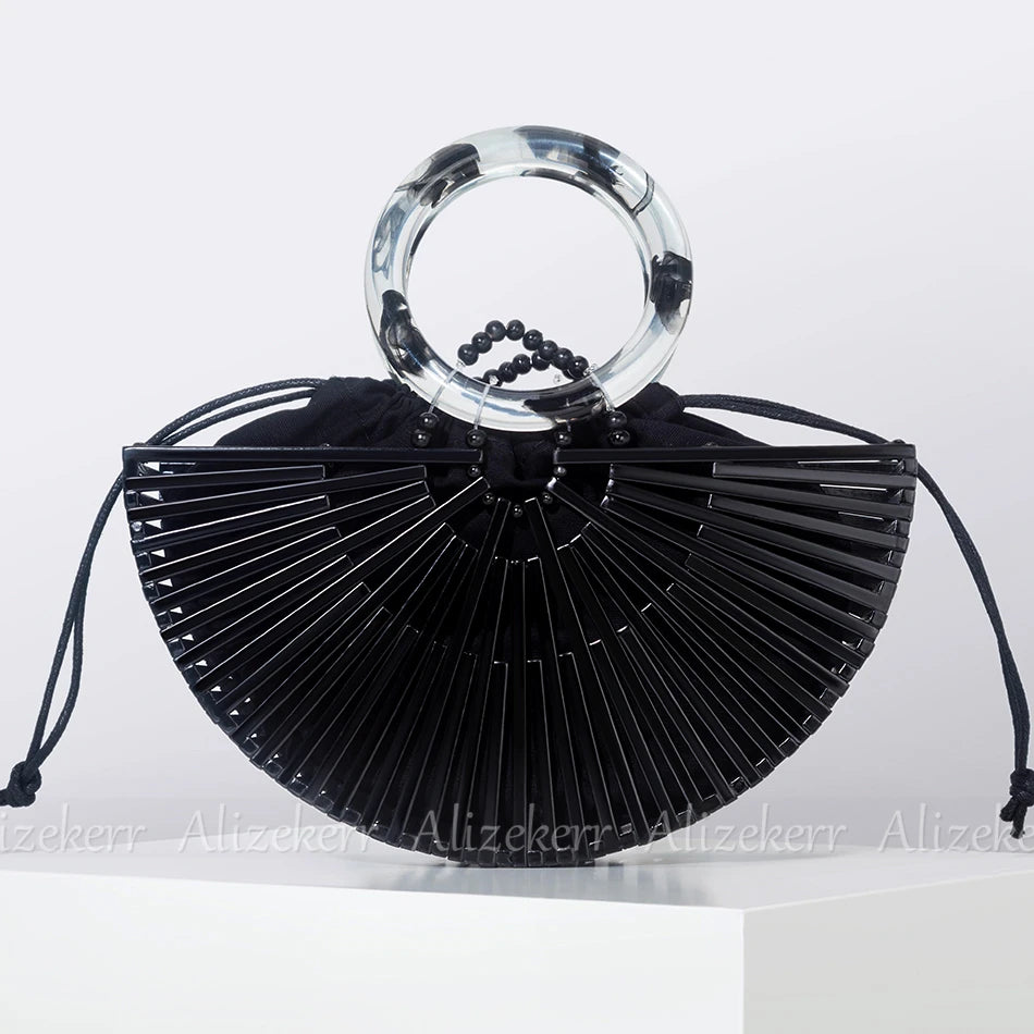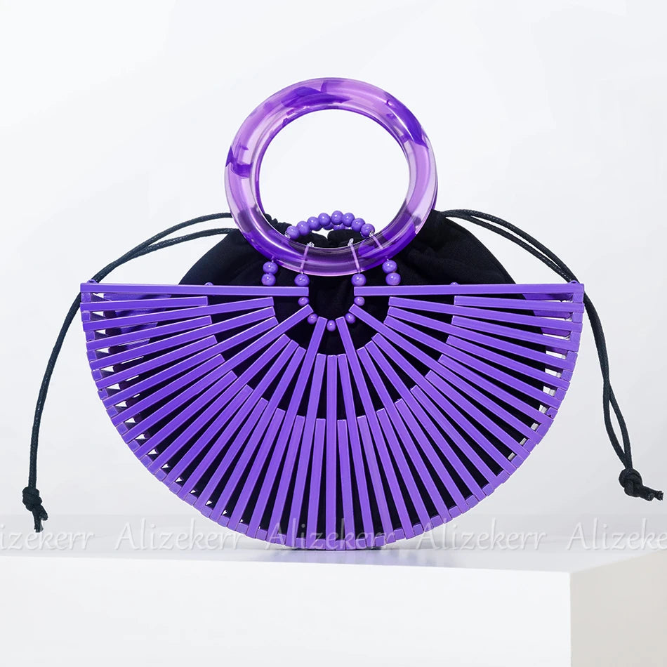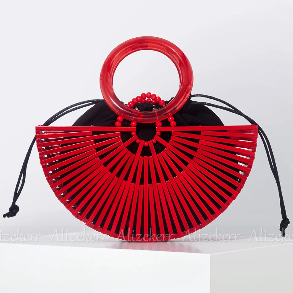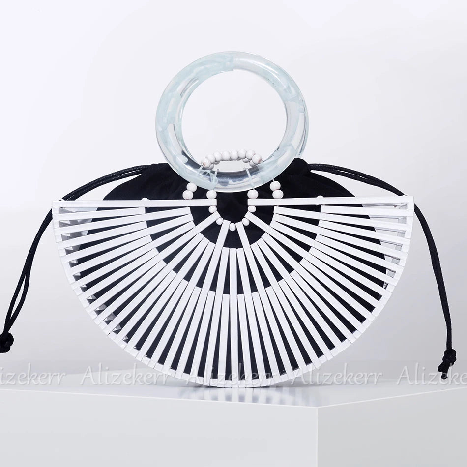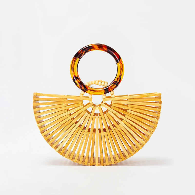 Een trendy, hoogwaardige handtas voor dames, perfect voor de zomer en vakantie. Deze tas combineert een Vintage halfronde vorm met de natuurlijke uitstraling van geweven stro en bamboe. De unieke uitgeholde constructie en de ronde acryl handvatten maken dit een opvallend en stijlvol accessoire voor het strand of een zomerse wandeling.