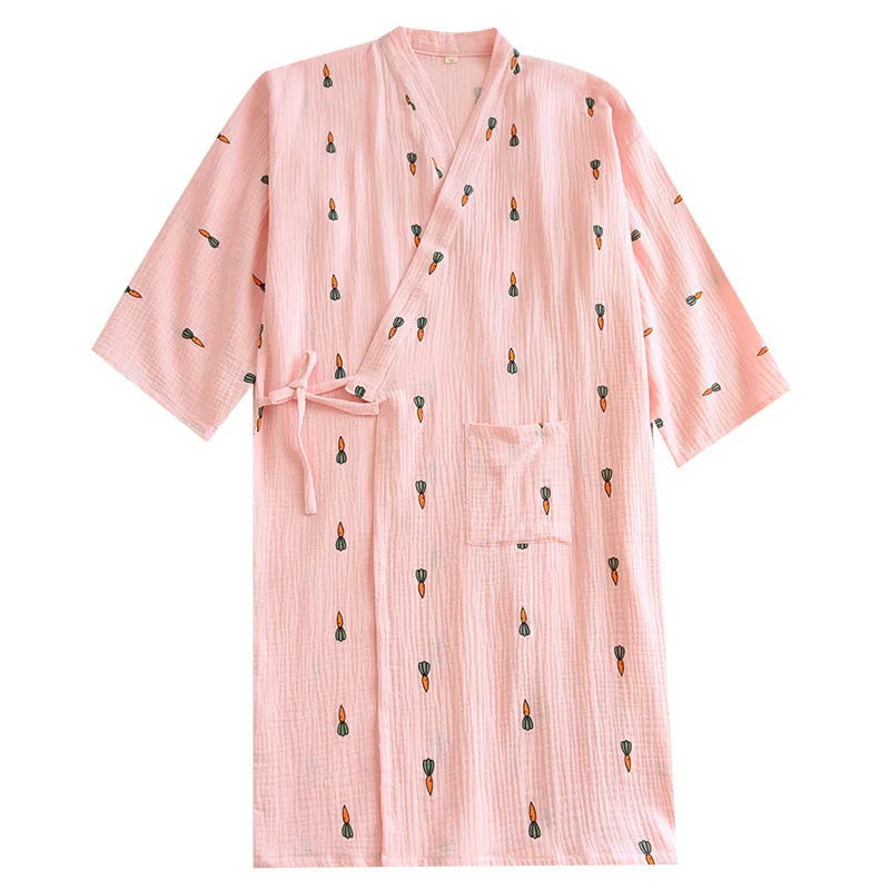 Deze dunne badjas/pyjamajas is ideaal als comfortabele huishoudkleding voor dames in de zomer. De jas is gemaakt van 100% katoenen crêpe, een lichte en ademende stof. De stijl is geïnspireerd op een Japanse kimono met een V-hals en heeft een unieke en speelse print van een cartoon wortel. Het is beschikbaar in 4 kleuren.