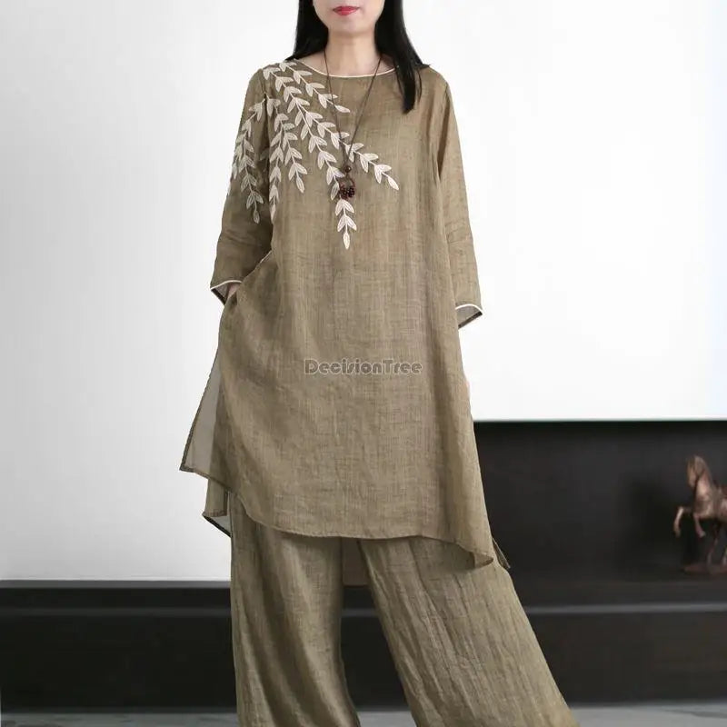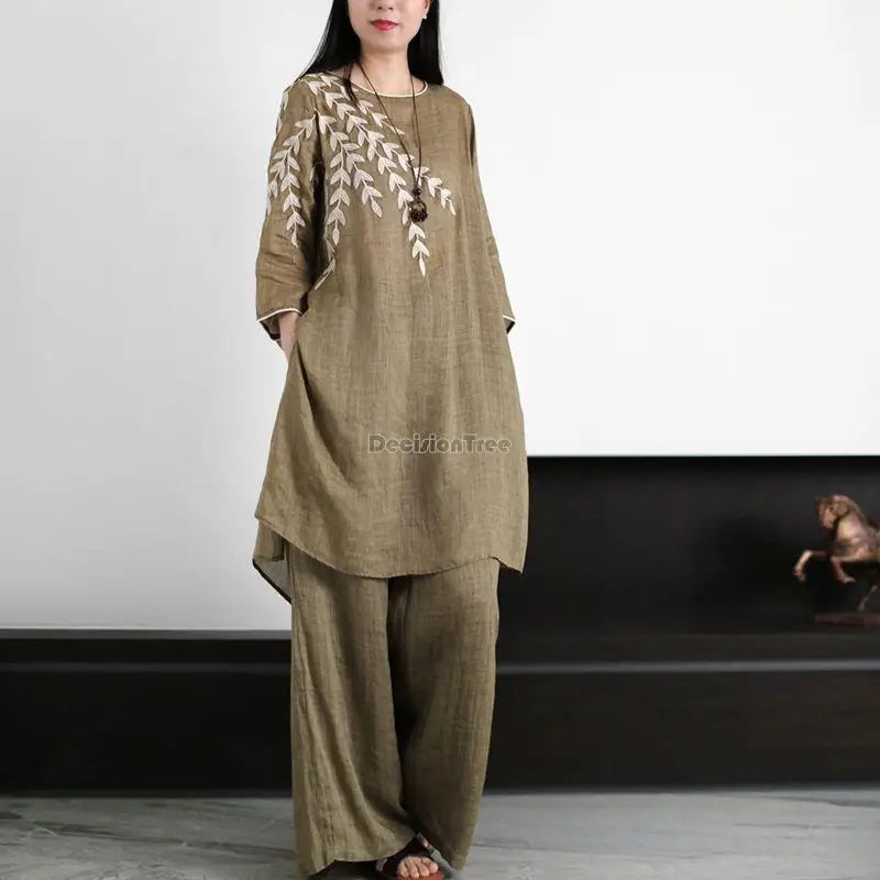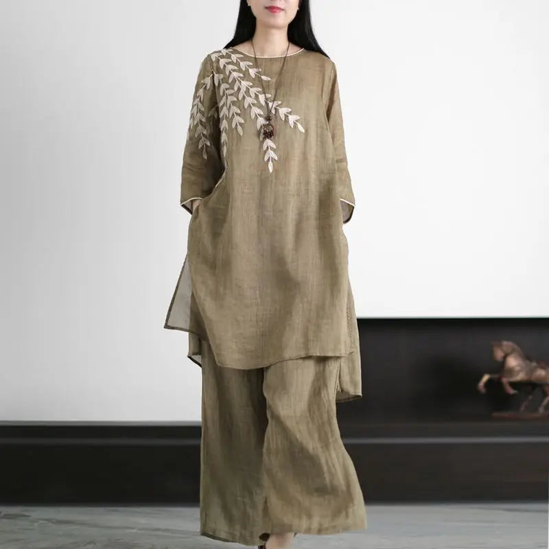 Dit is een losvallende tweedelige set, perfect voor de warmere maanden, die een gevoel van rust, eenvoud en natuurlijke elegantie uitstraalt, kenmerkend voor de 'Zen'-stijl.