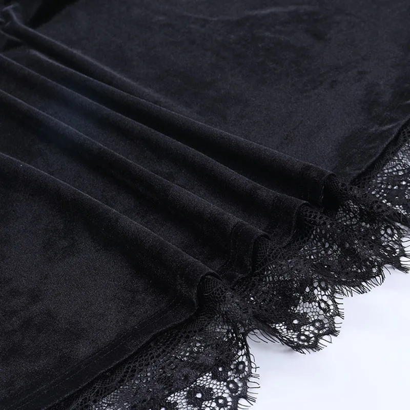 Gothic Lolita Girl Lace Trim Velvet A-Line Dress Women Sexy Perspective Long Sleeve V Neck Slim Mini Dress Cosplay Party Costume