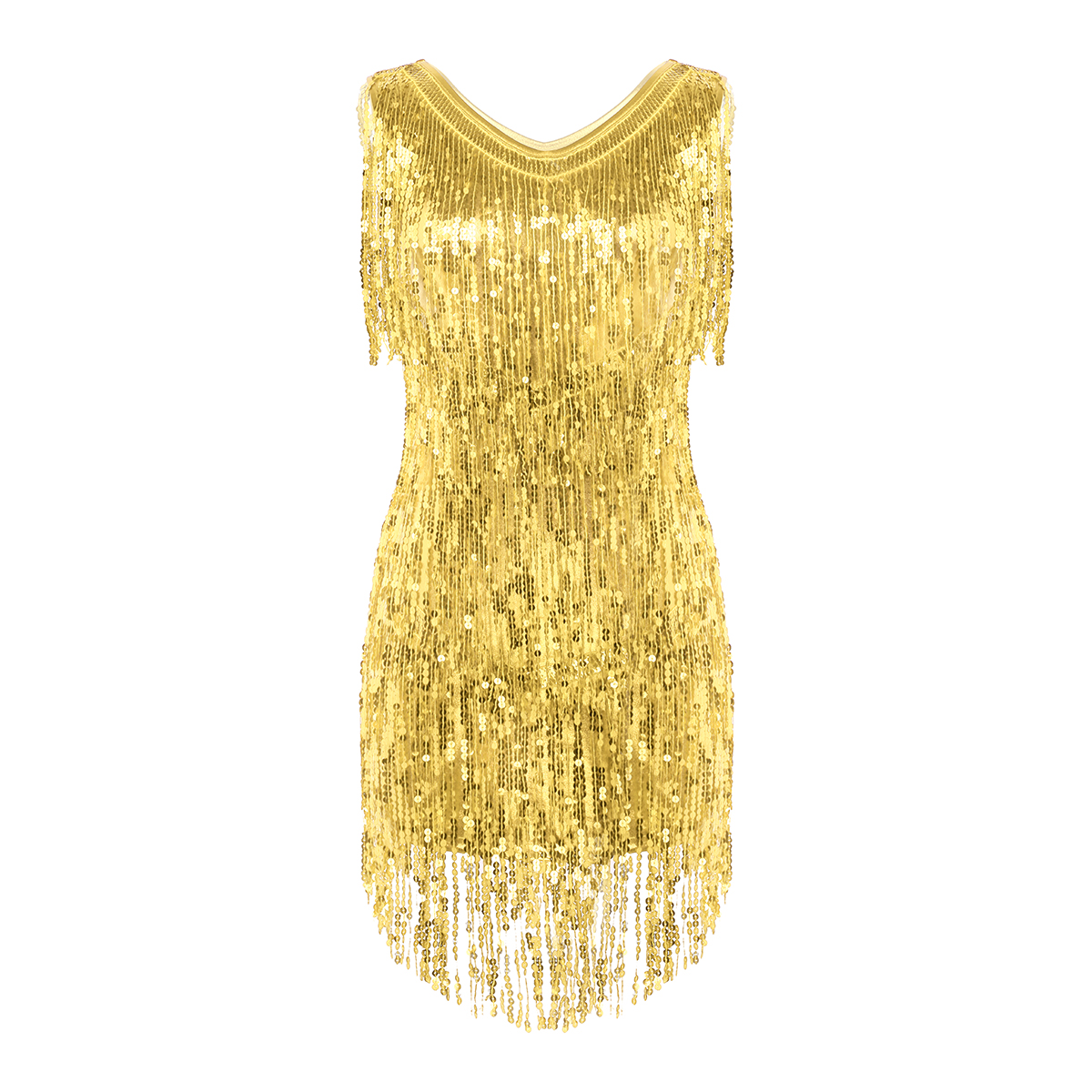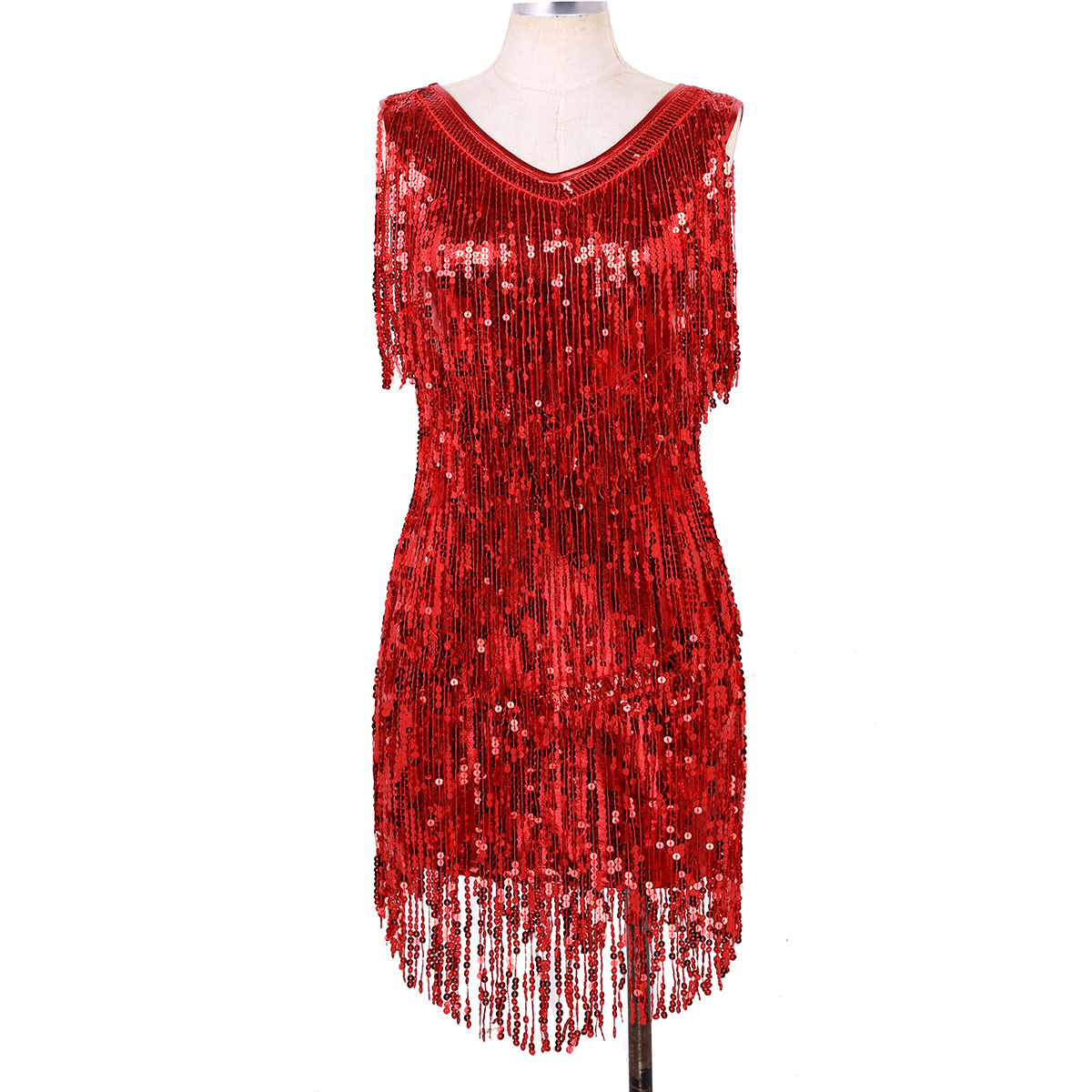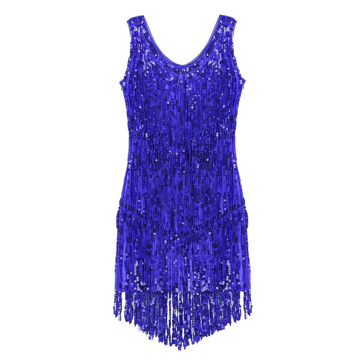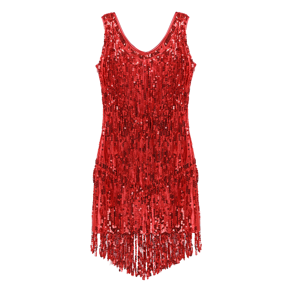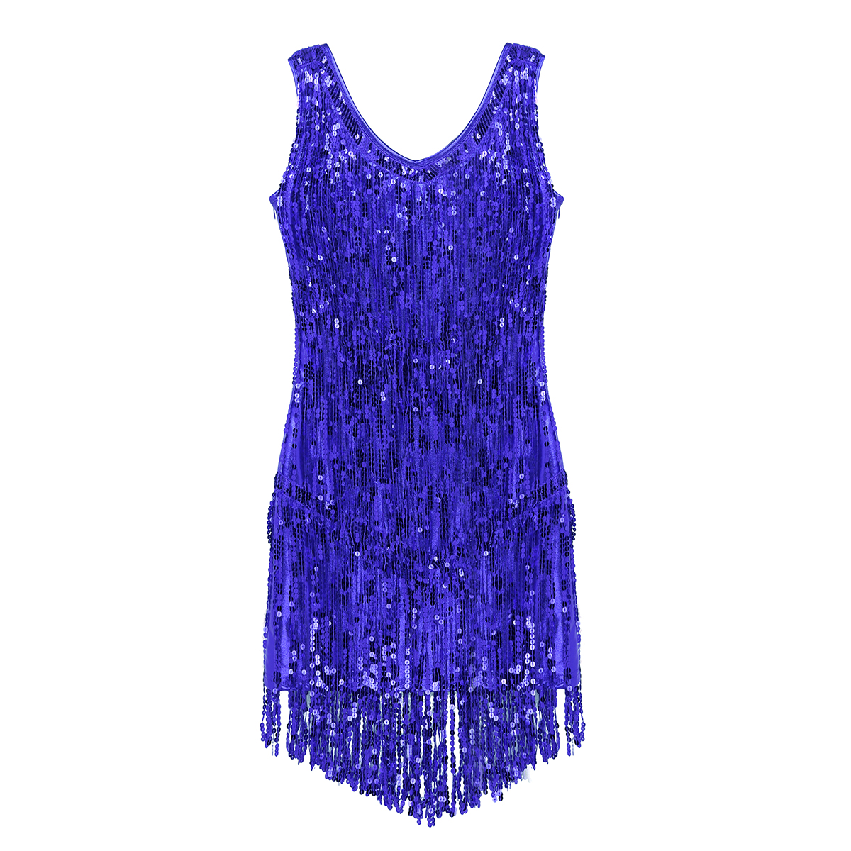 Sleeveless and V-neck, tiered sparkling sequins tassels design, make you a super star when you dance, knee length.