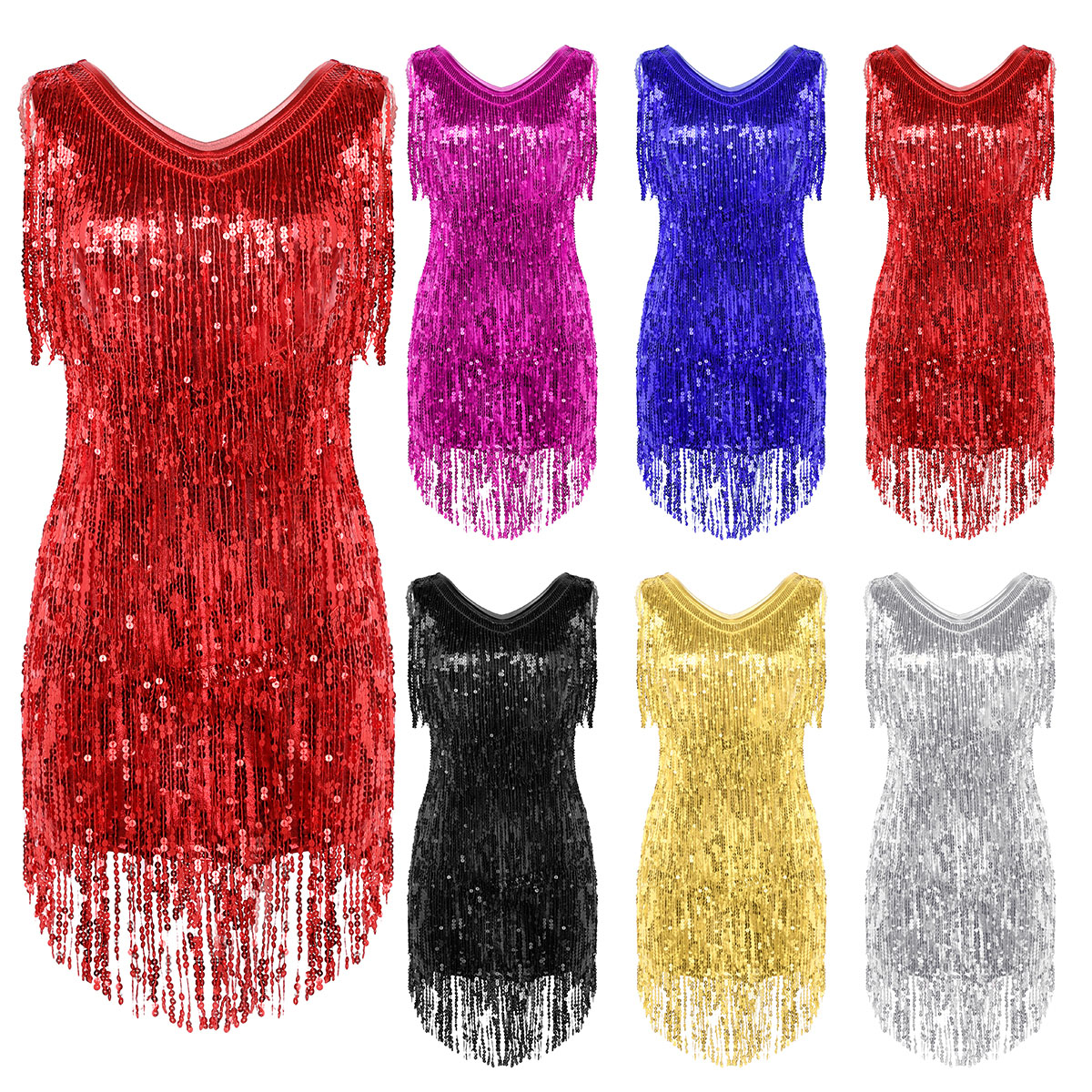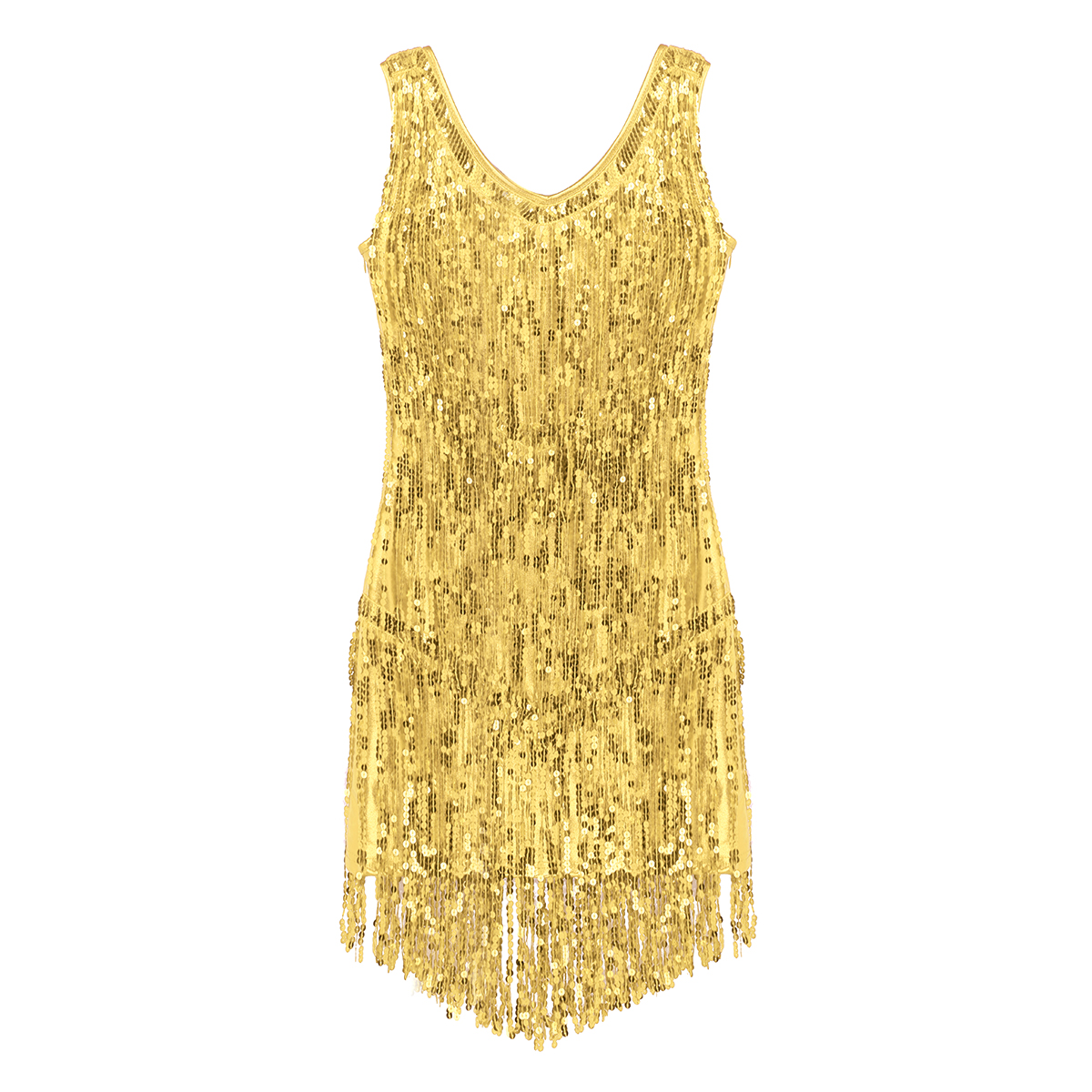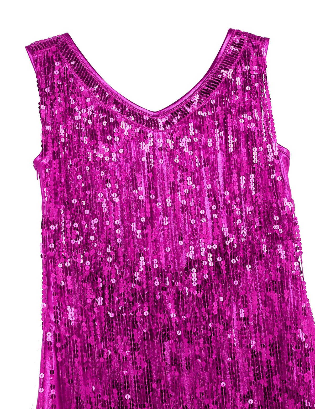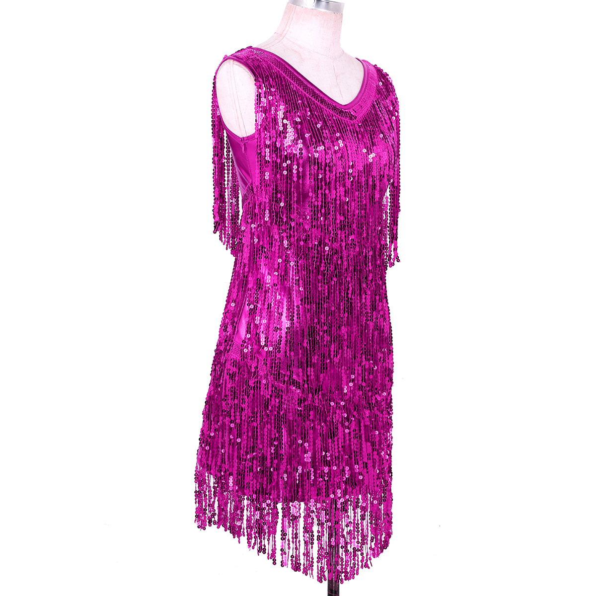 Sleeveless and V-neck, tiered sparkling sequins tassels design, make you a super star when you dance, knee length.