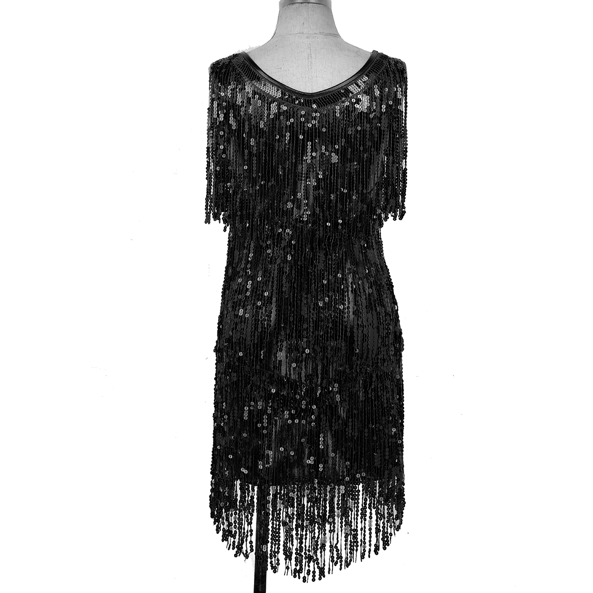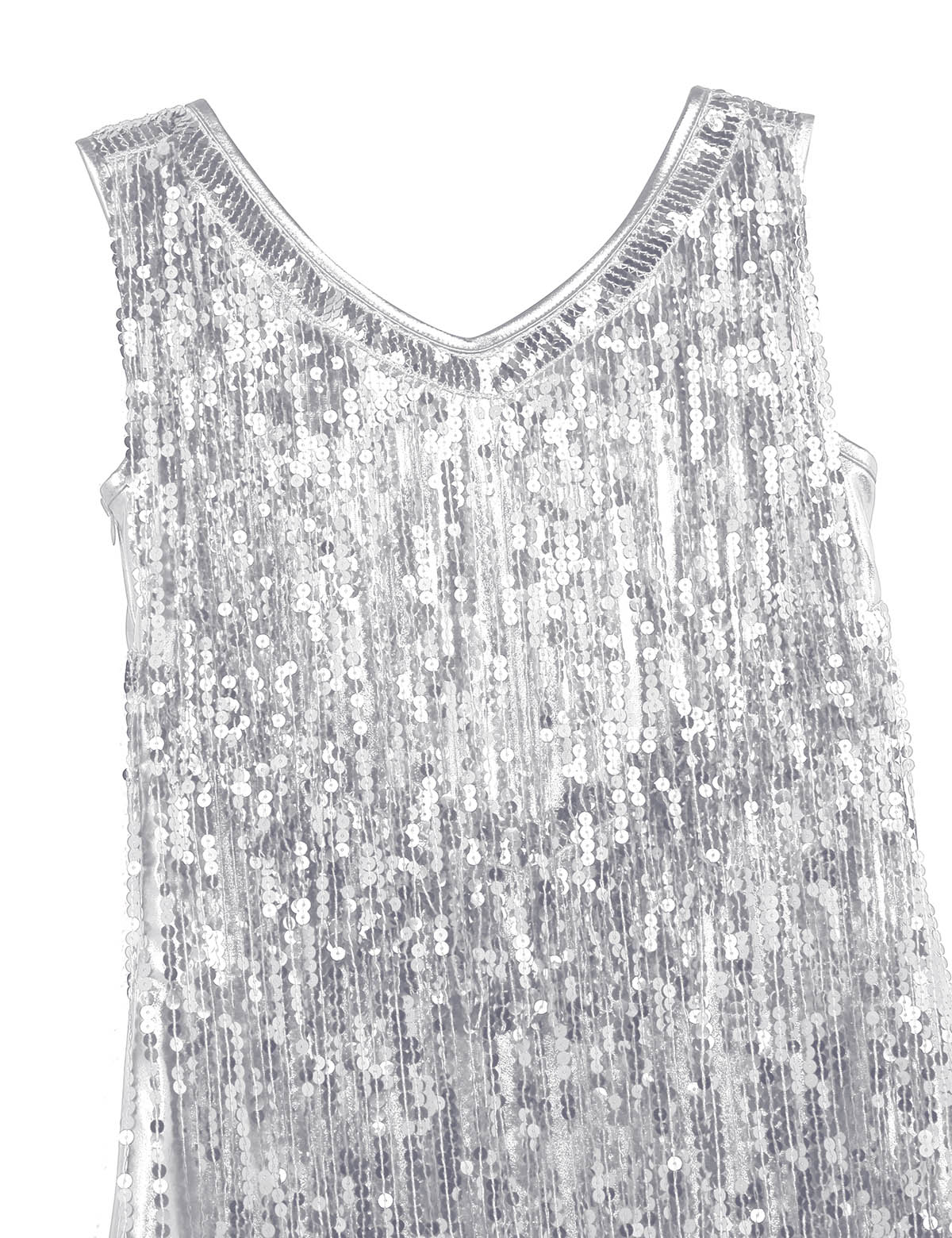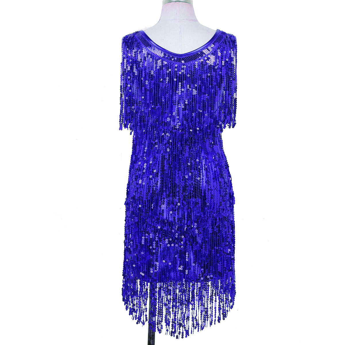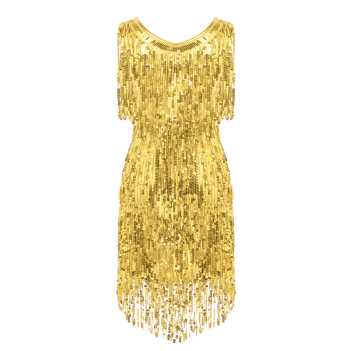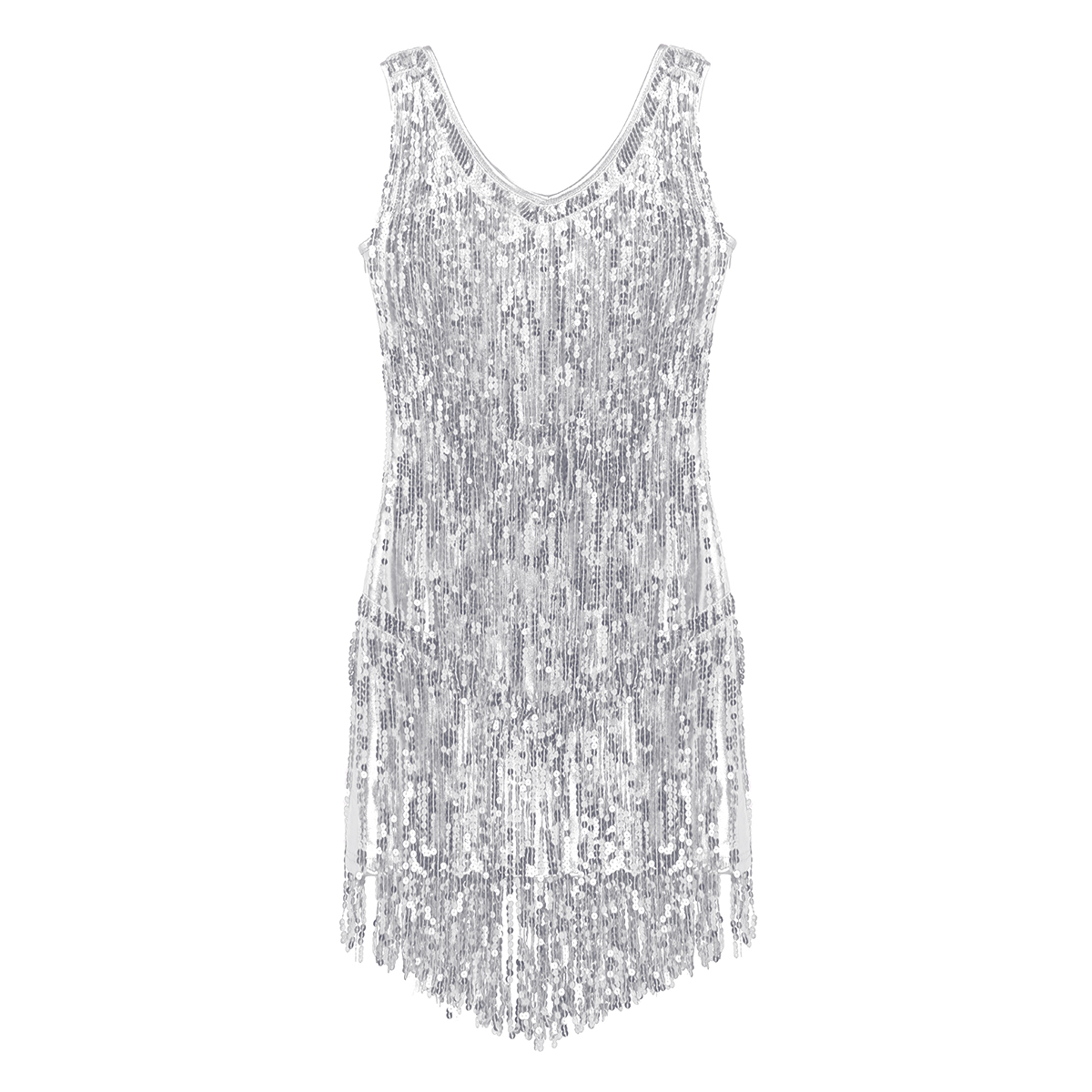Sleeveless and V-neck, tiered sparkling sequins tassels design, make you a super star when you dance, knee length.