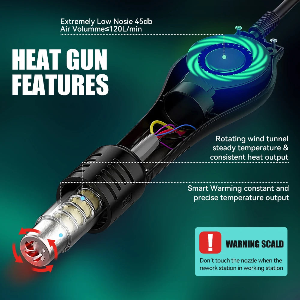 [ Advanced Functions, Safety Features ] An in-holder standby function to help cool the hot air gun when it is not in use, preserving your hot air gun in mint condition for longer. Equipped with YIHUA’s exclusive Hot Air Gun Fail-safe function to make your work safer, and effectively prevent the risk of any fire hazards.